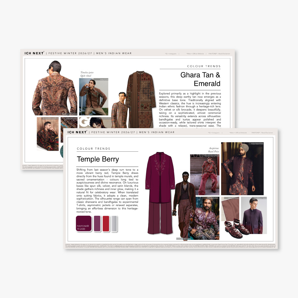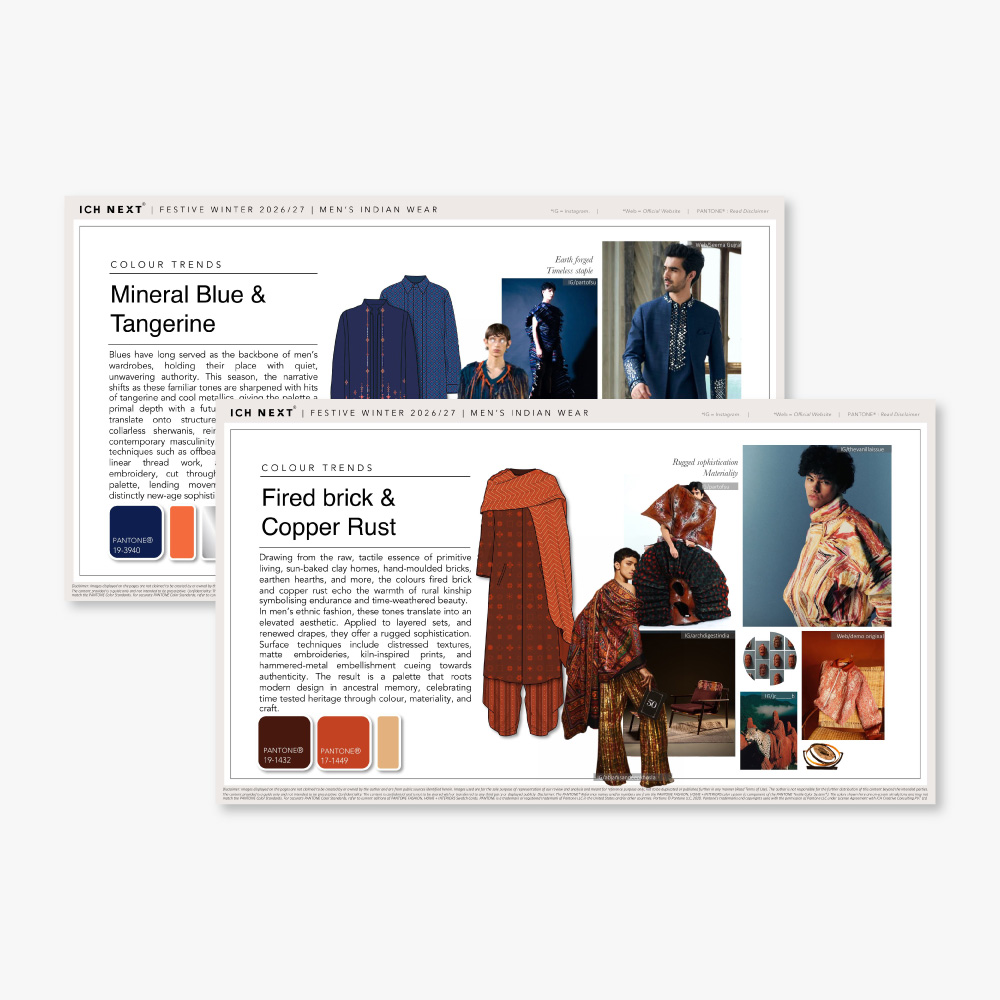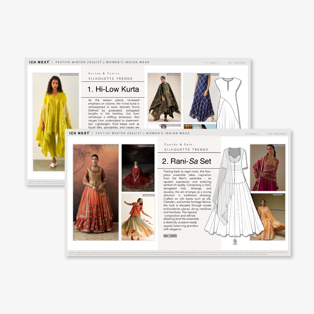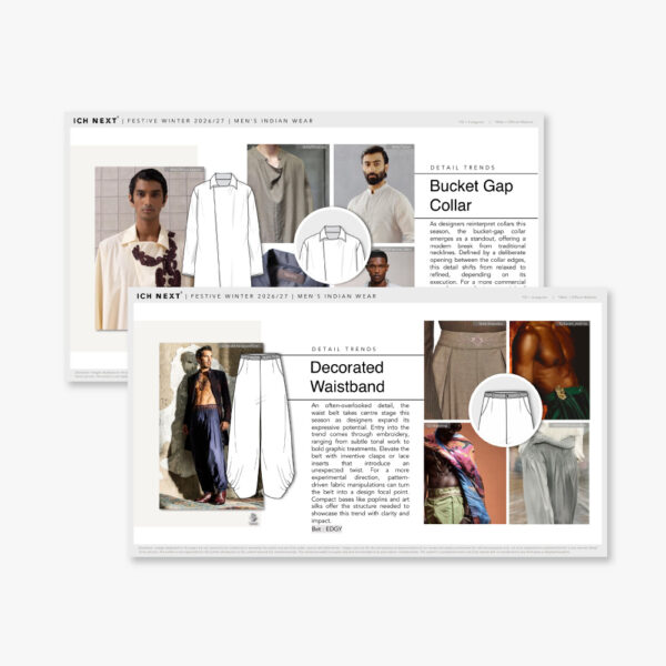 “For FW26–27, ethnic wear shifts decisively toward micro-detailing, where small, intentional alterations create noticeable upgrades towards sophistication. Collars emerge as a central zone of innovation, explored through double stacks, elongated forms and clean piping treatments that subtly alter proportions while retaining wearability. The silhouettes rely on firmer fabric foundations such as cotton satins and tailored suiting bases, chosen for their ability to hold structure while accommodating jacquard techniques and surface treatments.”