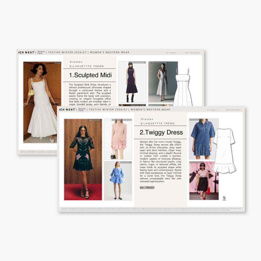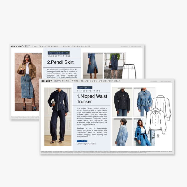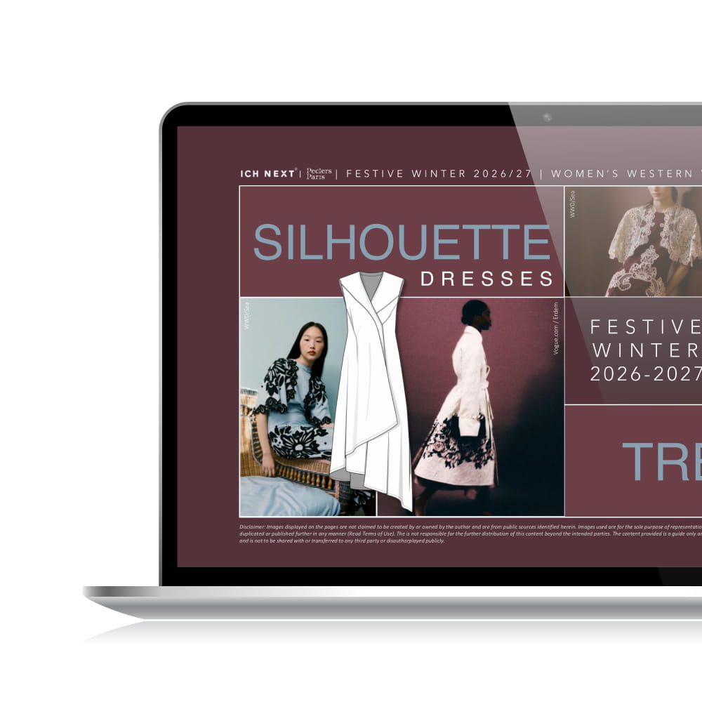 Discover the new and emerging long term trends in details and silhouettes across top, bottom and outer wear for Festive Winter 2026/27, complete with illustrations and image references. Get cues...
