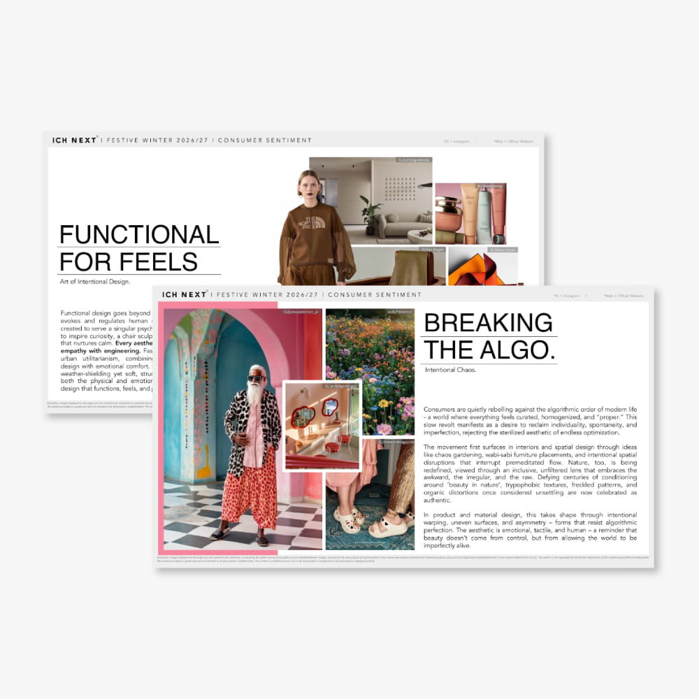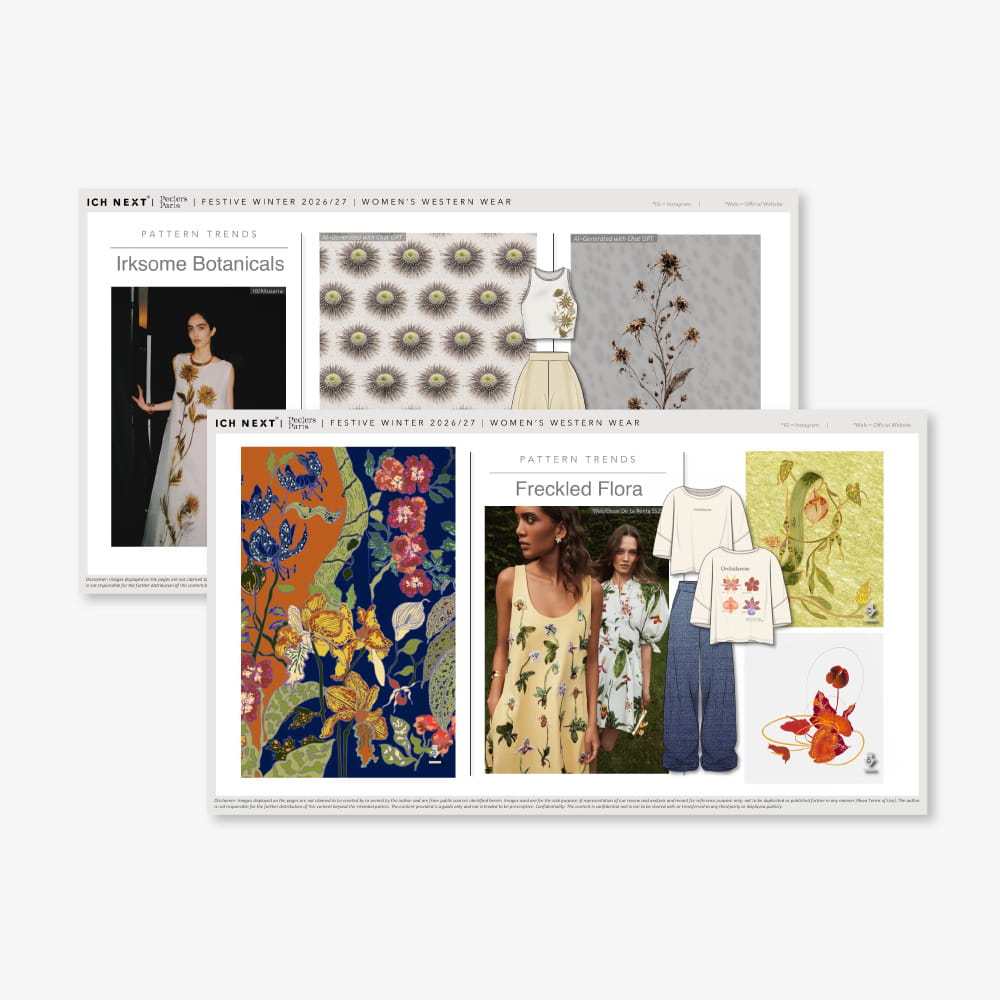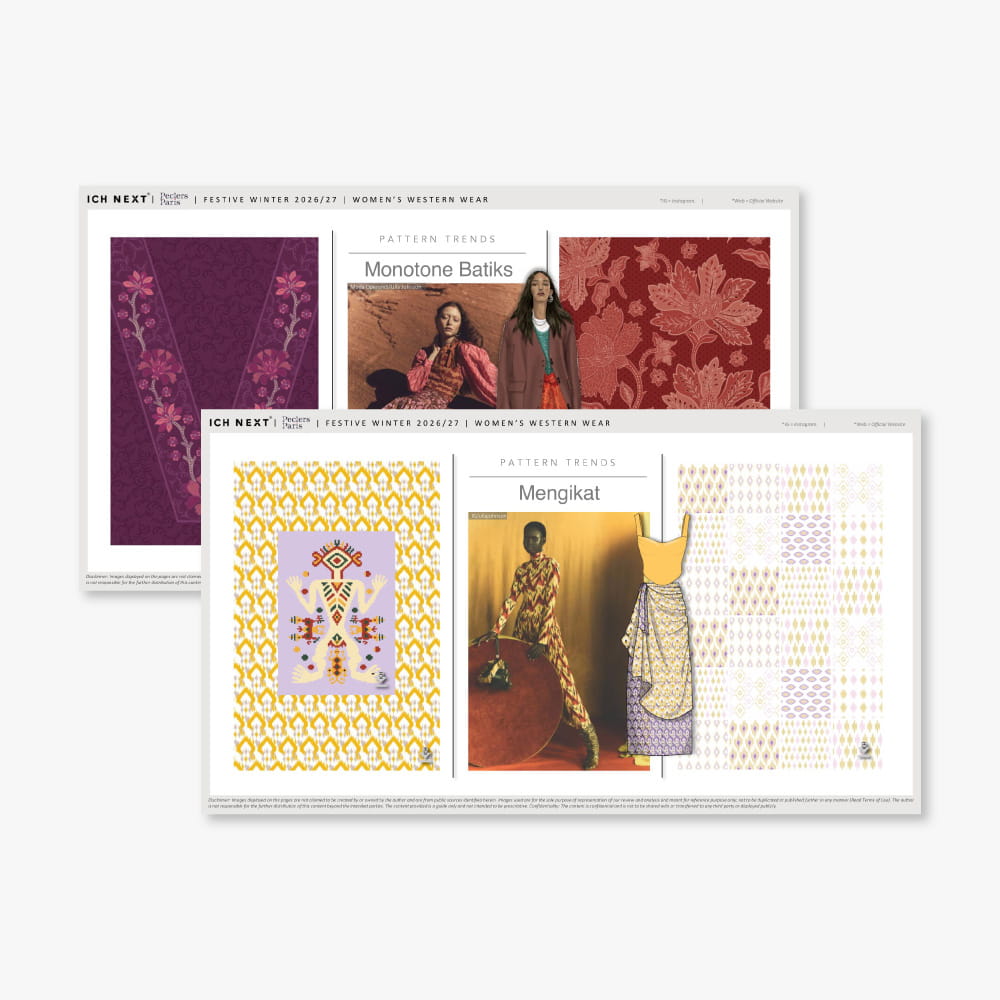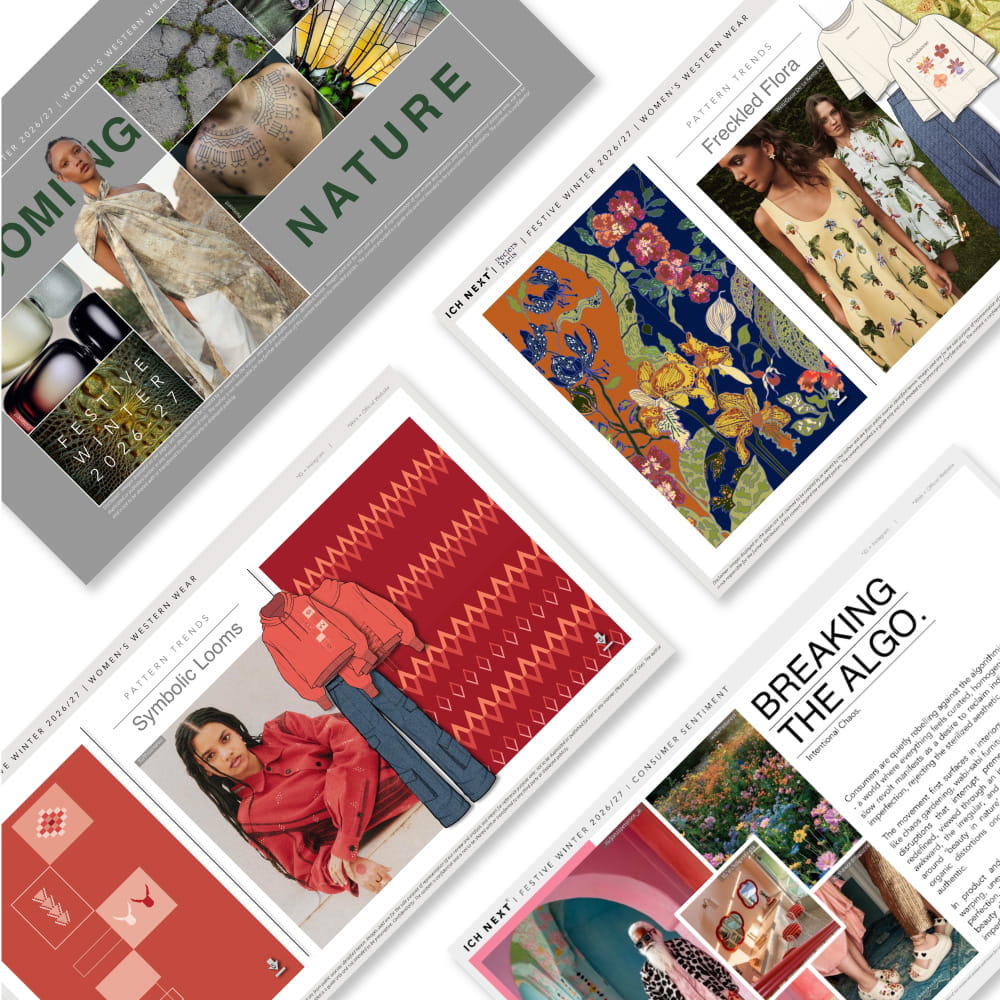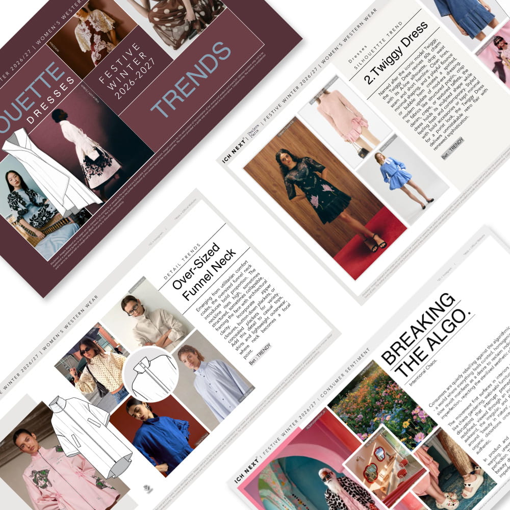 Unlock a world of fashion insights with our expertly crafted reports designed to inspire and inform. Each colour/ pattern/ silhouette/ capsule trend report is packed with everything you need to stay ahead. Each of these reports speak to macro trends that have a long-term impact on the consumer. We provide in-depth analysis and direction, helping you incorporate these designs seamlessly into your creations.